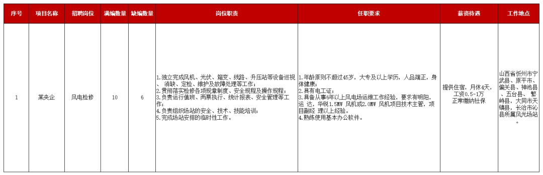 某央企單位因工作需要,由山西晉鑫仁和人力資源管理有限公司公開招聘數(shù)名風(fēng)電檢修勞務(wù)外包工作人員,具體公告如下: